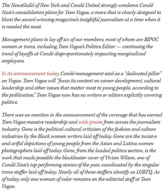 Conde Nast laid of nearly every woman of color writing for Teen Vogue earlier today, and announced plans to fold what remains of the magazine into the parent Vogue Magazine after killing off the political content the magazine was famous for.
